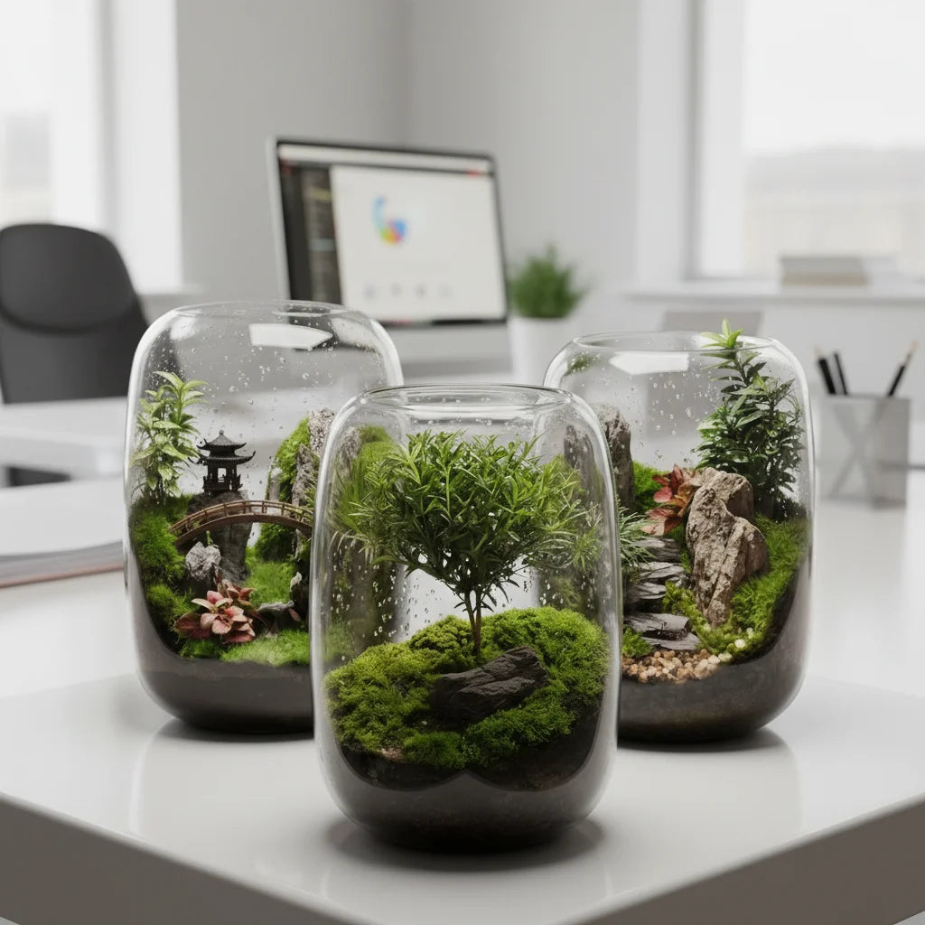 Our terrariums are designed to be low-maintenance, self-sustaining ecosystems. They require very little water and thrive on indirect light, bringing you effortless natural beauty.